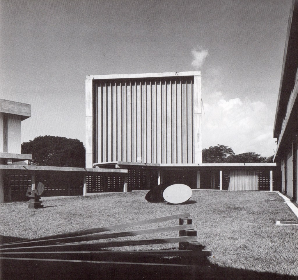 Entre los volúmenes se destacan: uno alto, cerrado, que hace recordar a los cubos del Pabellón de Montreal (1967), con marcadas líneas verticales producto de los elementos prefabricados con los cuales fue construido, que crean un juego de sombras; otros dos volúmenes, de dos niveles internos cada uno, tienen ventanas en la parte superior protegidas por aleros, de sol y de la lluvia frecuente de Ciudad Bolívar.