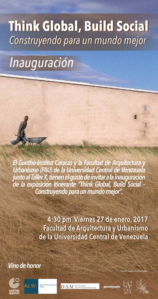 El pasado 25 de enero se inauguró en los espacios de la Facultad de Arquitectura y Urbanismo de la UCV la exposición itinerante Think Global, Build Social – Construyendo para un mundo mejor, bajo los auspicios de el Goethe-Institut Caracas, la FAU UCV y el Taller X. Abierta por primera vez en 2014 por el Architekturzentrum de Viena (Az W) y el Museo Alemán de Arquitectura (DAM) la muestra, que ya hizo escala en México y Chile en 2016, está conformada por una selección de ejemplos de arquitectura alternativa con enfoque social, que buscan mejorar las condiciones de vida de aquellas personas que viven en regiones poco privilegiadas, invirtiendo para ello el mínimo de recursos y aportando un alto grado de creatividad e iniciativa propia. Las 22 experiencias escogidas se centran en la responsabilidad social de la arquitectura contemporánea, mostrando un breve panorama de una arquitectura que enfoca sus esfuerzos de diseño en mejorar las condiciones de vida de muchas personas ubicadas en zonas de escaso progreso del mundo.