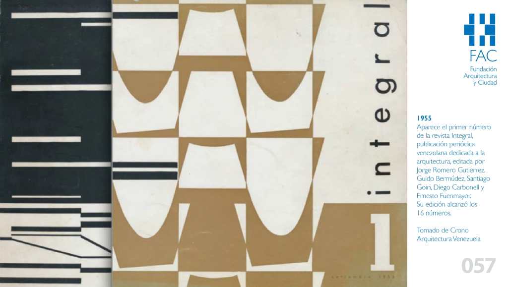 Con el claro precedente de la sección de Arquitectura e Ingeniería (ampliada posteriormente al urbanismo y artes plásticas) de la revista Cruz del Sur (ver Contacto FAC, nº 20, del 26-03-2016) y un año después de la aparición de a, hombre y expresión (considerada la primera revista dedicada fundamentalmente a la arquitectura publicada en el país), el “número 1” de Integral (septiembre 1955) que hoy ilustra nuestra postal, perteneciente a la serie que con ese calificativo hemos ido presentando desde aquí, nos conecta con el lanzamiento de un proyecto ambicioso como muchos de los emprendimientos de la oficina donde se gestó: arquitectura y urbanismo C.A. con Jorge Romero Gutiérrez a la cabeza.