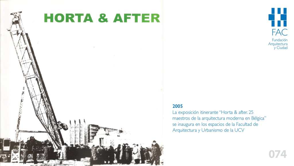 La Facultad de Arquitectura y Urbanismo de la UCV (FAU UCV) prácticamente desde su creación ha prestado particular atención a las actividades de extensión cultural y dentro de ellas a la captación de importantes exposiciones itinerantes que son ofrecidas por embajadas e instituciones de relevancia con sede en el país. Algunas de ellas ya han sido objeto de atención desde estas páginas por lo que hoy continuaremos dando cuenta de ello refiriéndonos a la que quizás ha sido una de las muestras más relevantes presentadas en los espacios expositivos de la FAU durante la primera década de este siglo: Horta & after. 25 maestros de la arquitectura moderna en Bélgica, abierta entre el 22 de noviembre y el 16 de diciembre de 2005, momento en el que se encontraba al frente de la Coordinación de Extensión el profesor José Guerra Cogorno.