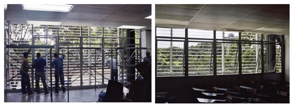 El peso de tales problemas, sufridos en definitiva por las 6.000 personas que empezaron a usar intensivamente el edificio, quienes para nada fueron considerados dentro de las ecuaciones iniciales que dieron inicio al planteamiento, produjeron la presión necesaria para que el COPRED se abocara el año 2005 a atender su adecuación a través de la contratación de dos proyectos que tuvieron por objeto atender, el primero, la puesta a tono de la estructura del edificio con la normas sísmicas vigentes (a cargo del Ing. Antonio Guell); y, el segundo, la incorporación de un “Sistema de Ventanería y Protección Solar de las fachadas norte y sur” que permitiese incorporar iluminación natural y ventilación cruzada a la mayor cantidad posible de ambientes, colaborar en aumentar los niveles de confort y le otorgase una identidad más próxima a las preocupaciones existentes en la obra de Villanueva (a cargo del Arq. Rafael Urbina). La descripción de este último trabajo (que afortunadamente fue ejecutado) se encuentra recogida en la ponencia “Adecuación de un edificio de aulas del campus universitario de la Universidad Central de Venezuela”, presentada por Rebeca Velasco y David Viloria en la Semana Internacional de Investigación de la FAU, octubre 2008. Para concluir, valga decir que este polémico edificio, centro de un candente debate suscitado a finales de la década de lo años 70 del siglo XX (ver Punto 62) por su condición de manifiesto de una manera de entender la arquitectura a contracorriente de lo que el ejercicio de la profesión tradicionalmente dictaba, se convirtió en toda una lección que posteriormente tanto el IDEC como el propio Hernández asimilaron en virtud del fracaso que acompañó su concepción una vez puesta en contacto con las circunstancias que lo rodeaban, más allá de los logros alcanzados como experimento constructivo.