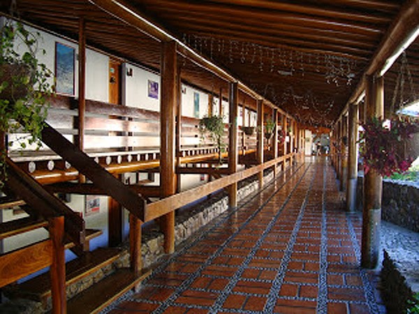 El esquema de edificio es sencillo: dos cuerpos desplazados sobre un eje longitudinal, articulados por el área de recepción y lobby desde la cual se aprecian los salones recreacionales. El cuerpo anterior, más ligado a la llegada desde la carretera, contiene el salón-comedor para convenciones con sus servicios y el posterior, culminación y remate del eje, las habitaciones, claramente separadas de la circulación general mediante un muy bien logrado espacio de transición integrado a un jardín exterior.