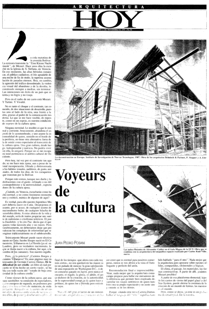… el 12 de noviembre de 1994 aparece en la primera página del número 86 de Arquitectura HOY, firmado por Juan Pedro Posani, el artículo “Voyeurs de la cultura” con el que se encenderá una rica e interesante polémica con Alberto Sato que luego también incorporará a otros lectores del semanario.
