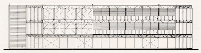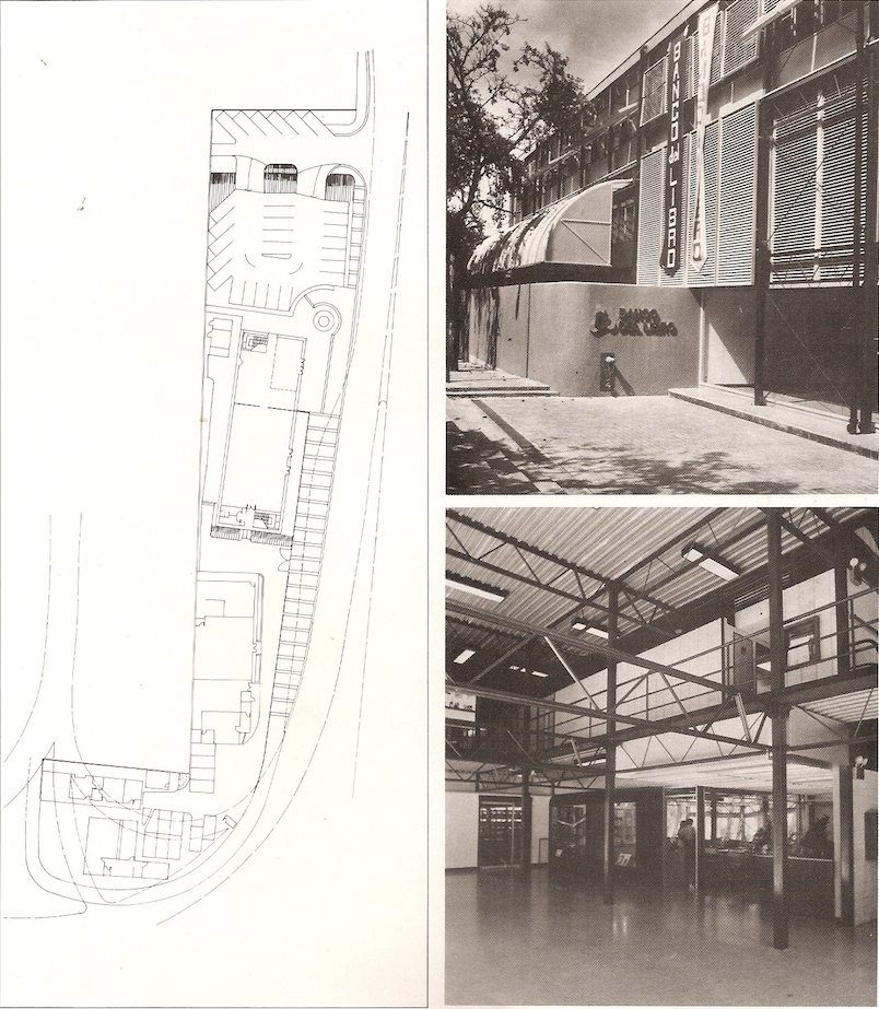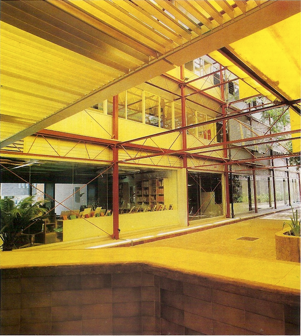 Haciendo valer su ya demostrada capacidad para sacar partido de las adversidades, Henrique Hernández ubica el edificio de 1.500 m2 de construcción, una bien proporcionada caja de tres pisos de 12.60 mts de ancho por 39.60 de largo y una altura de 9.15 mts, cuya planta responde a un módulo estructural de 3.60 mts a lo largo, con luces de 7.20 mts y 5.40 mts para cubrir el ancho, organizada en función de dos núcleos de circulación y servicios colocados uno a cada extremo, lo más alejado posible de las desfavorables condiciones de ruido y tráfico prevalecientes al sur, con la intención de lograr hacia el norte un modesto y a la vez digno acceso que estaría acompañado de una pequeña plaza (desde donde está tomada la foto que ilustra nuestra postal del día de hoy) en la que se proponía la inserción (no consumada) de una obra de Alejandro Otero. De esta forma se conseguiría también dar cabida más al norte a un pequeño estacionamiento y a la incorporación de los retiros como espacios de expansión (a modo de patios) de las actividades públicas ubicadas en la planta baja, gracias al atinado papel que juega el muro perimetral. Así, la edificación se convierte ella misma en acceso y elemento ordenador principal de las diferentes fases de crecimiento del programa y de ocupación del resto del complicado terreno.