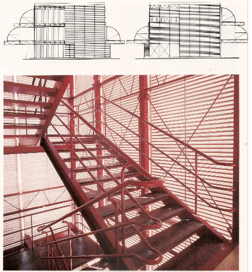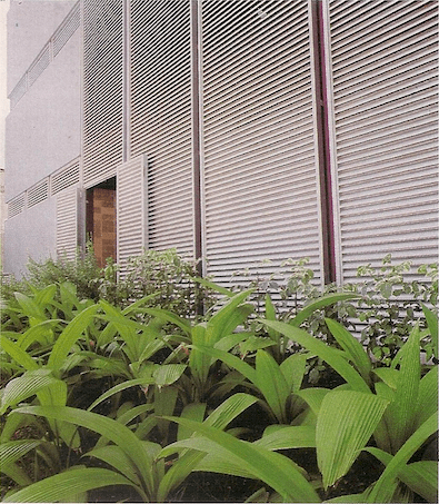 El otro gran acierto del edificio estriba en la manera como es tratada su envolvente la cual no sólo actúa como respuesta acorde a su desfavorable orientación, sino que brinda la oportunidad de llevar a cabo una cuidadosa selección de los elementos que la integran y sobre todo de incorporarle un rico y variado dinamismo. Sin abandonar preocupaciones de índole funcional que privan a la hora de mostrar al exterior los ambientes que su piel recubre, las fachadas del edificio hablan por si solas de un claro deleite por la composición de los planos que las definen y su permanente diálogo con la modulación estructural: romanillas fijas y móviles (de variadas dimensiones) de aluminio anodizado, así como marcos de ventanas y cerramientos sólidos del mismo material, se combinan contrastando con casquetes seccionados a media bóveda en fibra de vidrio de color amarillo, inyectándole a la ligereza de las cerchas y columnas que componen el sistema constructivo una sugerente capacidad expresiva que no atenta contra su sobriedad. Todo este esfuerzo estético, reforzado con la participación de Carlos Cruz-Diez en el tratamiento del hall de entrada, deriva, además, en haber logrado condiciones óptimas de ahorro energético ante las circunstancias adversas del medio.