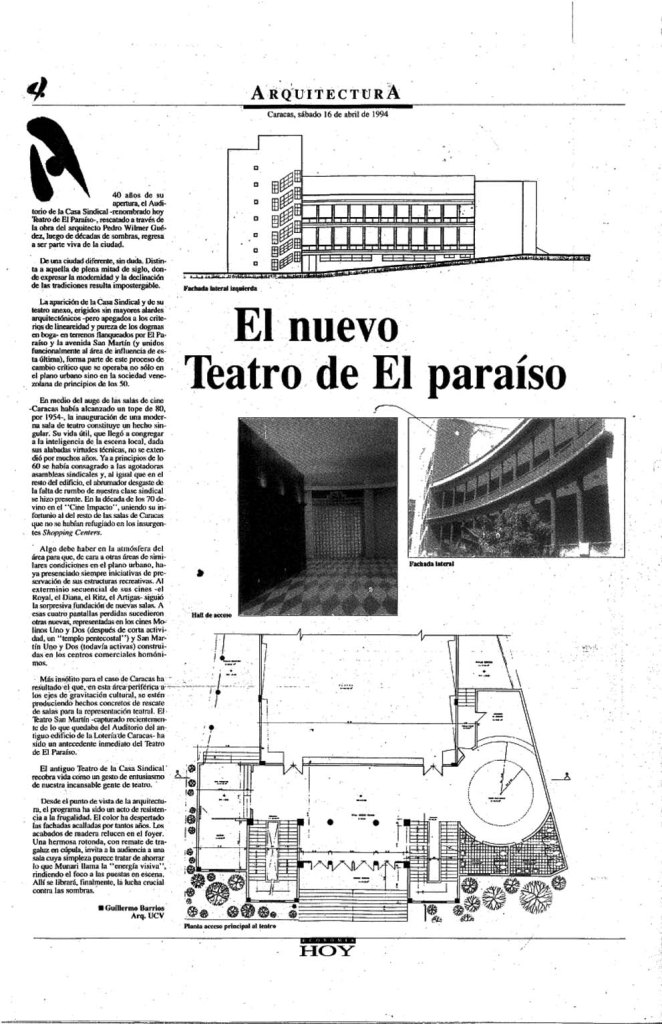 Tal y como señala Guillermo Barrios en “El nuevo Teatro de El Paraíso”, reseña aparecida en Arquitectura HOY el 16 de abril de 1994: “La aparición de la Casa Sindical y de su teatro anexo, erigidos sin mayores alardes arquitectónicos -pero apegados a los criterios de lineareidad y pureza de los dogmas en boga- en terrenos flanqueados por El Paraíso y la avenida San Martín (y unidos funcionalmente al área de influencia de esta última), forma parte de este proceso de cambio crítico que se operaba no sólo en el plano urbano sino en la sociedad venezolana de principios de los 50”.