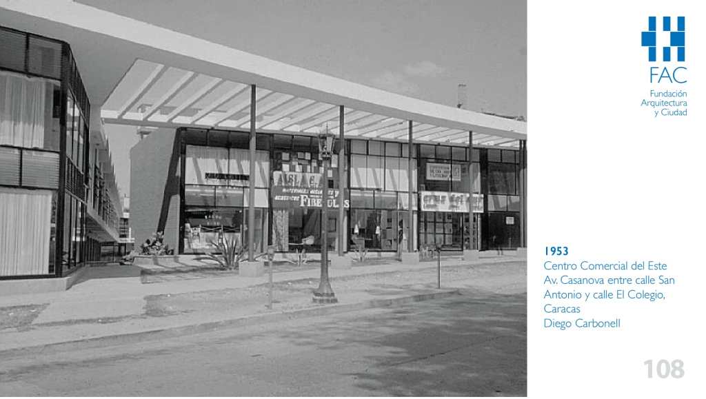 La imagen que ilustra nuestra postal del día de hoy muestra una toma parcial de la fachada este que da hacia la calle El Colegio (entre la Calle Real de Sabana Grande y la avenida Casanova, Caracas) del Centro Comercial del Este, terminado de construir en 1953, obra del arquitecto Diego Carbonell (Rio de Janeiro, 1923- Caracas, 1998). Esta edificación tiene el privilegio de disputarle al Gran Avenida (Guinand, Benacerraf y Vestuti, de finales de los 40 e inicios de los 50) el ser considerado como primer shopping de la ciudad en virtud de que ambos empezaban a mostrar, aunque fuese a pequeña escala, las características propias de esta tipología proveniente de Norteamérica, cuyo desarrollo es explicado de forma didáctica, entretenida y rigurosa por Lorenzo González Casas en el ensayo “Compraventas en CCS: De la bodega esquinera al mall” que puede consultarse en http://www.ccscity450.com.ve/ensayo/compraventas-en-ccs-de-la-bodega-esquinera-al-mall/.