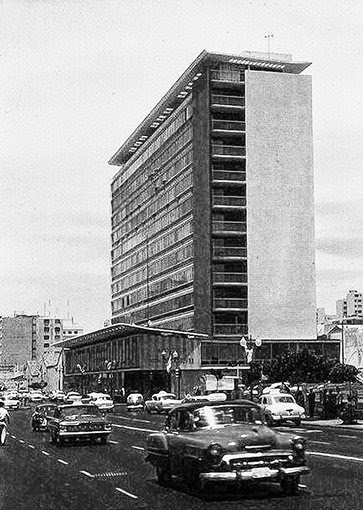 Nuestra postal del día de hoy recoge la imagen del edificio EDOVAL, proyecto del arquitecto de origen alemán residenciado en Venezuela Federico Guillermo Beckhoff (1919-1982), cuya construcción se concluye el año 1963. Ubicado en la esquina de Mijares, Av. Este 3 con Av. Norte 2, Caracas, esta edificación de rasgos absolutamente modernos se ubica en el ángulo nor-este del terreno donde se construyó posteriormente la nueva sede del Banco Central de Venezuela diseñada, como se sabe, por Sanabria Arquitectos.