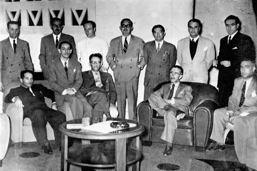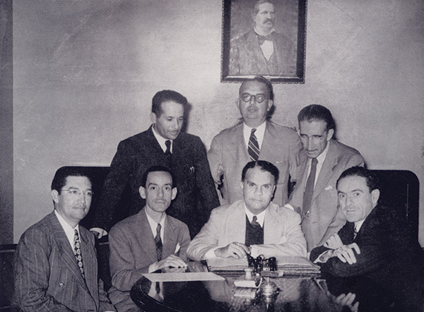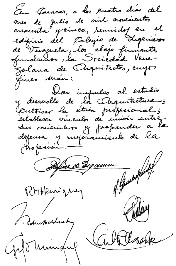 1945, año que marca el fin de la Segunda Guerra Mundial y registra grandes cambios tanto a nivel nacional como internacional, ve cómo son recogidos en unas pocas líneas los fundamentos de la asociación gremial que da origen a la celebración del 4 de julio. En un alarde de magistral síntesis, los fundadores de la SVA suscriben un breve documento manuscrito que plasma los fines totalmente vigentes del organismo recién creado: “Dar impulso al estudio y desarrollo de la Arquitectura; cultivar la ética profesional; establecer vínculos de unión entre sus miembros y propender a la defensa y mejoramiento de la profesión”. La primera Junta Directiva de la Sociedad estuvo compuesta por Carlos Raúl Villanueva (Presidente), Luis Eduardo Chataing (Vicepresidente) y Heriberto González Méndez (Secretario). El año siguiente se realizó la constitución formal de la SVA en la Oficina de Registro Público. La Junta Directiva, que sustituyó a la Junta original, estaba compuesta por Carlos Guinand Sandoz como Presidente, Cipriano Domínguez como Vicepresidente y Heriberto González Méndez, una vez más como Secretario. A lo largo del tiempo, “los siete”, con la excepción de Bergamín (el único arquitecto extranjero de entre ellos) y García Maldonado, ocuparon puestos en la Directiva de la Sociedad.