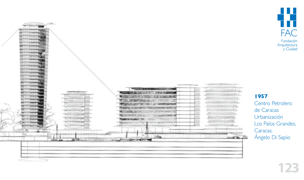 El Centro Petrolero de Caracas, del cual presentamos un corte-fachada como ilustración de nuestra postal del día de hoy, fue proyectado en 1957 por el arquitecto de origen italiano Angelo Di Sapio en terrenos de la Urb. Los Palos Grandes al este de la ciudad de Caracas.