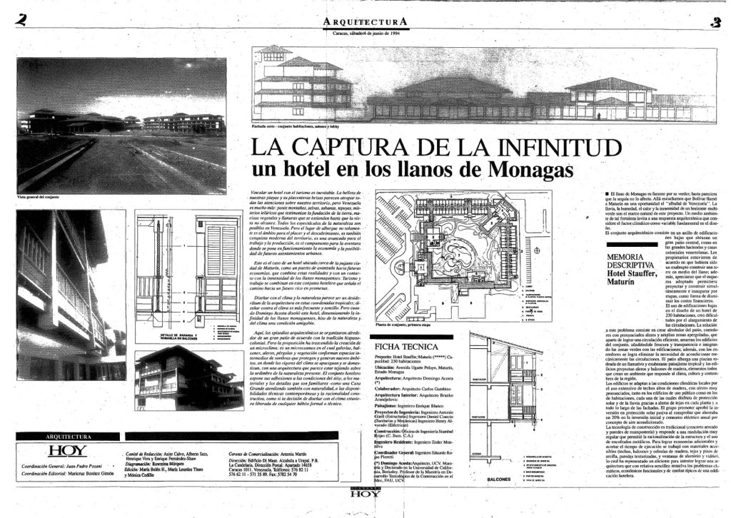 En un terreno de más de 3 hectáreas, con un área de construcción de cerca de 20.000 m2, un total de 230 habitaciones y el apoyo de todos los servicios que han permitido catalogarlo como un hotel cinco estrellas, su bien logrado diseño ofreció a los redactores del Arquitectura HOY la ocasión de presentarlo en las páginas centrales de su nº 64 (4 de junio de 1994) acompañándolo, entre otros, del siguiente comentario: “…la proposición ha trascendido la creación de un microclima; es un microcosmos en el cual galerías, balcones, aleros, pérgolas y vegetación conforman espacios intermedios de sombras que protegen y generan nuevos ámbitos, en donde los rigores del clima se apaciguan y se domestican, con una arquitectura que parece estar tejiendo sobre la urdimbre de la naturaleza presente. El conjunto hotelero expone sus adhesiones a las condiciones del sitio, a los materiales y los detalles que son familiares -como una Casa Grande- atendiendo también con naturalidad, a las disponibilidades técnicas contemporáneas y la racionalidad constructiva, como si la decisión de diseñar con el clima estuviera liberada de cualquier hábito formal o técnico”. Quizás valga la pena observar de nuevo la postal para confirmar lo expresado en el semanario.