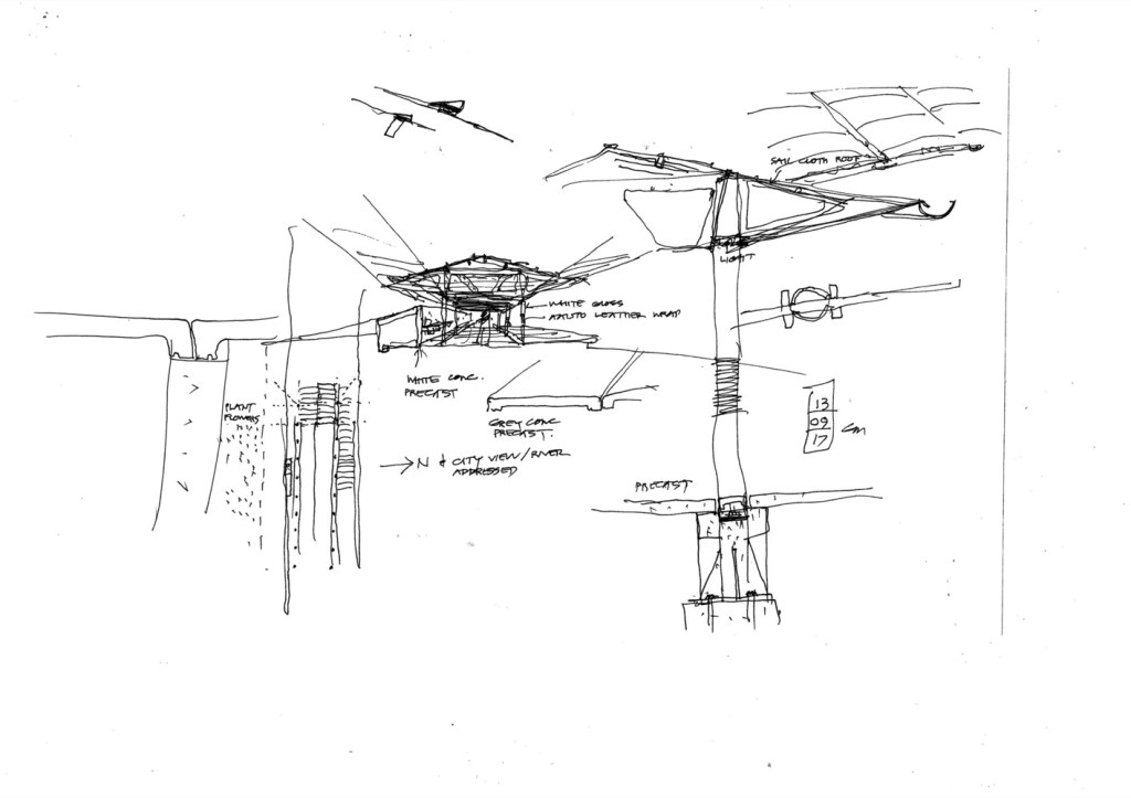 – El borde y diseño del cuenco aliviador existente en el predio resuelto para poder albergar gradas y anfiteatros para espectáculos a realizarse en el espejo de agua.