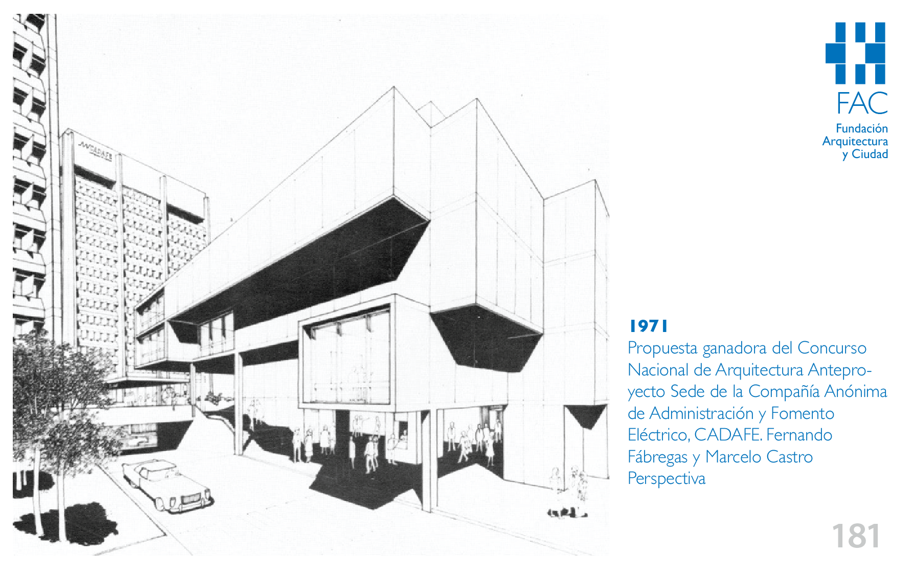 En Venezuela, el año de 1971 fue particularmente intenso en lo que a la convocatoria o desenlace de concursos de arquitectura se refiere. Organizados todos bajo el auspicio de un activo Colegio de Arquitectos de Venezuela (CAV), al certamen correspondiente a la sede del INOS (ver Contacto FAC nº 106 del 09/12/2018) se sumaron el de la Sala de Conciertos y Sede de la Orquesta Sinfónica Venezuela (posteriormente denominado Complejo Cultural Teresa Carreño) y el del Edificio Sede de la Compañía Anónima de Administración y Fomento Eléctrico (CADAFE), cuya propuesta ganadora es el objeto de nuestra postal del día de hoy.