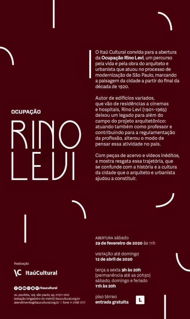 La muestra se inspira en la carta-manifiesto del joven Levi como base para narrar la vida y obra del arquitecto y urbanista quien participó en el proceso de modernización de Sao Paulo a partir del final de la década de 1920. Autor de diversos edificios que van desde residencias hasta cines y hospitales, Rino Levi (1901-1965) dejó un prolífico legado en el campo del proyecto arquitectónico, donde actuó también como profesor y contribuyó a reglamentar la profesión, alterando el modo de pensar de esa actividad en el país.