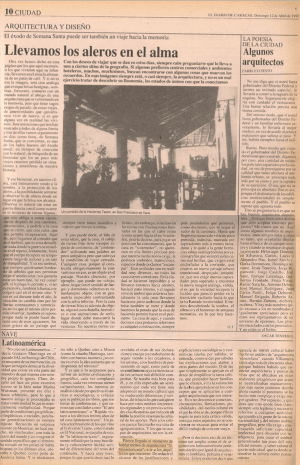 … el domingo 12 de abril de 1992, Oscar Tenreiro publica en El Diario de Caracas el artículo “Llevamos los aleros en el alma”.