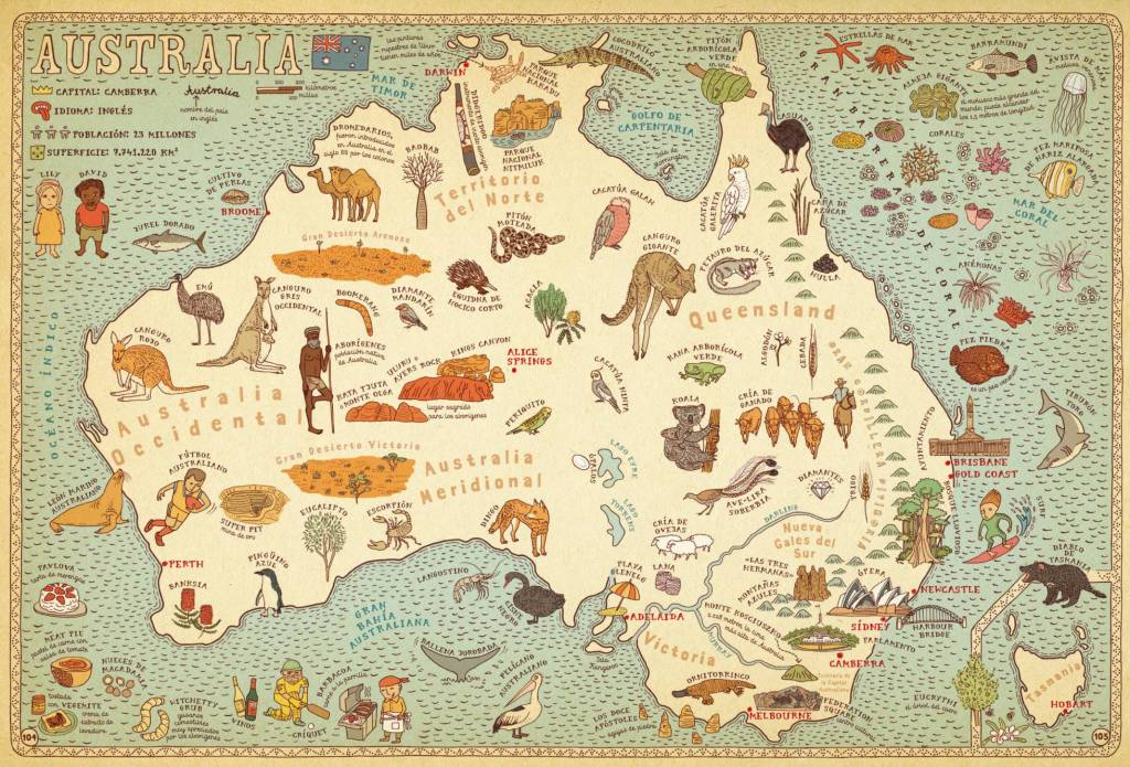 A esta particular lista cartográfica se añade otro notable ensayo: el del historiador británico Jerry Brotton, que tuvo la idea de contar la historia del planeta a través de lo que explican y expresan sus planisferios y lo materializó en Historia del mundo en 12 mapas (editorial Debate, 2012). La famosa proyección cartográfica de Gall-Peters de 1973, que muestra una versión menos eurocéntrica que la ofrecida por Gerardus Mercator en 1569, es una de las que comenta en su libro. Fue precisamente Mercator, cuenta Brotton, quien acuñó el término “atlas” para referirse a una colección de mapas, formato que sigue fascinando a adultos y niños, pues nos sirve para comprobar nuestras carencias en materia geográfica y para corregir errores de percepción, pero también para gozar de sus ilustraciones, especialmente si sus autores son artistas como los polacos Aleksandra Mizielinska y Daniel Mizielinski. Su Atlas del mundo (editorial Maeva, 2015) cuenta con 55 mapas a doble página que contienen más de 4.000 miniaturas —desde el instrumento musical típico de una región hasta la fauna propia de una zona—.