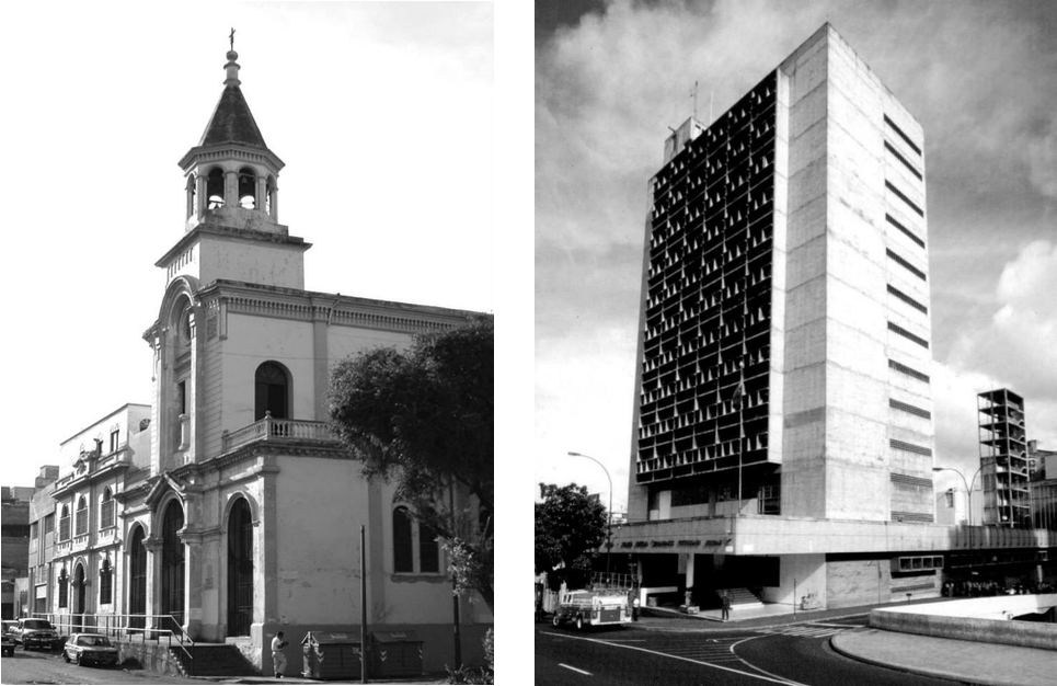 - Edificio Sudameris (lado este, esquina Plaza España, cruce con la Av. Urdaneta; al comienzo sede del Banco Francés e Italiano para América del Sur -luego Banco Latino- y de Ars Publicidad; Vincenzo Nasi, 1956).