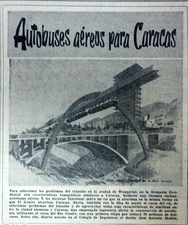 Luego, en 1954 se plantea otro sistema de transporte masivo, “un monorriel similar al Schewebebahn de Wuppertal, que según la proposición, seguiría el curso del río Guaire” y “entre 1956 y 1957 una misión de origen francés ofrece un sistema llamado ‘Metro-Robot’, que consiste en unos vagones de rueda de caucho sobre pista de rodamiento de madera. Pero ninguna de estas propuestas fueron tomadas en cuenta”.