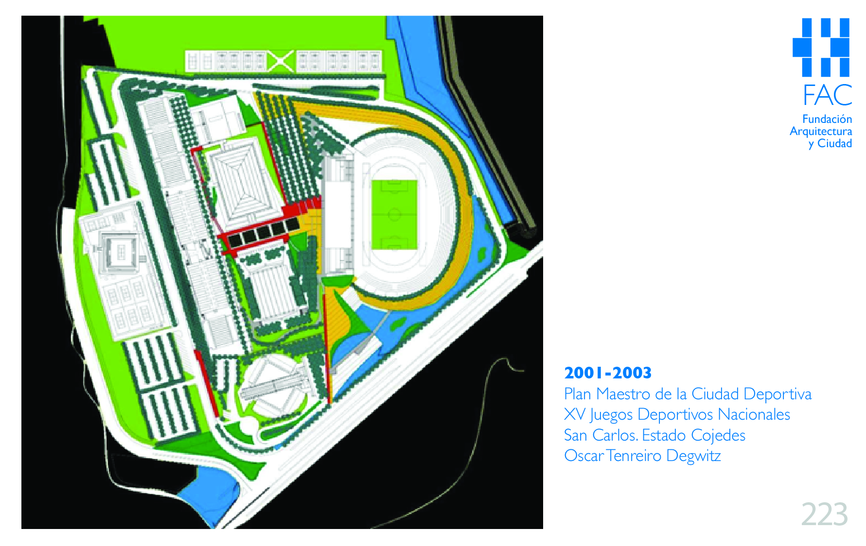 Martínez, egresado en 1990 del Taller Firminy y entre 1994 y 2007 también profesor dentro de este grupo docente de diseño fundado en 1983 por Oscar Tenreiro dentro de la Escuela de Arquitectura de la FAU UCV, saltando por encima de las acostumbradas vías clientelares que recomendaban no contar con “la disidencia” para realizar cualquier trabajo impulsado desde el gobierno, decide convocar a Tenreiro para que realice el Plan Maestro (cuya imagen ilustra nuestra postal del día de hoy) y a un grupo de arquitectos, en su gran mayoría docentes de la FAU, para que desarrollen los proyectos de las instalaciones. Es así como a finales de 2001, con el tiempo apremiando para poder cumplir con la fecha de inicio (2003), con base en el plan trazado por Tenreiro se le asignan a Joel Sanz, Jorge Rigamonti, Augusto Terán, Ana María Marín y José Luis Sánchez, Edwing Otero, José Alejandro Santana y al propio Tenreiro la ejecución de los proyectos del Centro de Tenis, el Pabellón para Gimnasia Olímpica, el Centro de Ajedrez, el Centro de Piscinas, los Gimnasios de Combate, el Estadio Olímpico, y el Centro de Atención al Atleta más el Gimnasio de Basket, respectivamente. Todos, valga decir, capaces profesionales con muy poca obra construida.