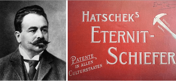 Según consta en su biografía, Hatschek compró en 1893 una fábrica de papel en desuso en Schöndorf, cerca de Vöcklabruck, Austria. Para esta fábrica, adquirió máquinas de hilar de amianto (asbesto) usadas de una hilandería incendiada en Lend fibra que, sumada al cemento, celulosa, aire y agua, le permitió concretar la idea de producir un material “más ligero que el ladrillo, más barato que la pizarra y mejor que la chapa”. De lo que recogemos del portal https://www.eternit.at, Hatschek “llama al primer material de construcción producido industrialmente del mundo ‘Eternit’, derivado del latín ‘aeternus’, que significa algo así como ‘eterno’ y debería revolucionar el mercado: debido a las propiedades físicas especiales de los paneles Eternit, como resistencia a las heladas, resistencia al fuego y de peso ligero, el material de construcción encuentra rápidamente partidarios”.