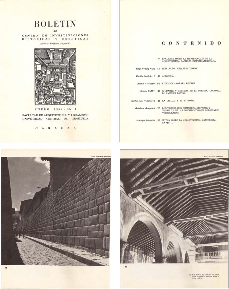 Para constatar parte de lo señalado, el contenido que se recoge en aquel primer número estuvo conformado por: la “Encuesta sobre la significación de la arquitectura barroca hispanoamericana”, elaborada por la “Comisión de Trabajo” dirigida a 11 especialistas en la materia a nivel internacional; los ensayos “Intelecto arquitectónico” de Sibyl Moholy-Nagy, “Arequipa” de Emil Harth-terré, “Edificar-Morar-Pensar” de Martín Heidegger, “Ciudades y cultura en el período colonial de América Latina” de George Kubler, “La ciudad y su historia” de Carlos Raúl Villanueva, “Los techos con armadura de pares y nudillos de las construcciones coloniales venezolanas” de Graziano Gasparini; y las “Notas sobre arquitectura manierista en Quito” de Santiago Sebastián. Las excelentes fotos que acompañan algunos de los artículos fueron aportadas en su casi totalidad por Graziano Gasparini.