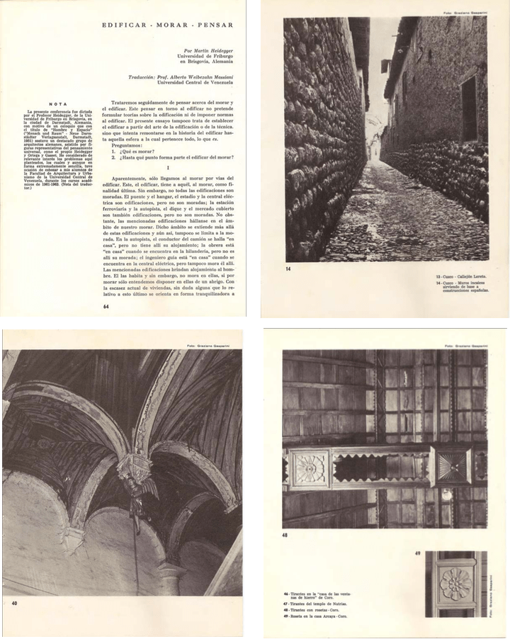 De este completo grupo de textos cabe señalar que existe un abanico que abarca la crítica, la historia, la cultura, la ciudad, la restauración y muy particularmente el pensamiento, donde destaca el de Heidegger, traducido por el profesor de “Materias Humanísticas” de la Escuela de Arquitectura, Alberto Weibezahn Massiani, una de las primeras y más ajustadas traslaciones al español sobre la famosa conferencia dictada por el filósofo alemán en la Universidad de Friburgo con motivo del Coloquio “Hombre y espacio” (1951), en el que también participó José Ortega y Gasset que ha sido objeto de consideración y motivo de discusión entre arquitectos de varias generaciones. En adelante, el BOLETÍN, ira creciendo en prestigio y densidad, ampliará el número de sus colaboradores y se convertirá como asevera Lameda “en referencia ineludible de los estudios e investigación sobre historia de la arquitectura y el urbanismo tanto en nuestra nación como en América Latina”.