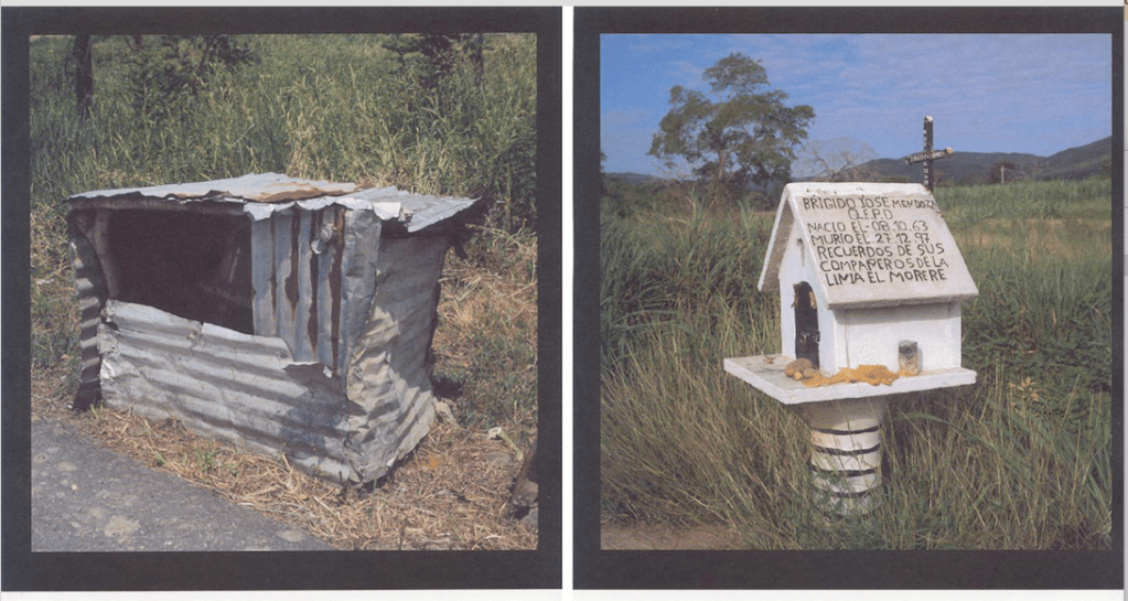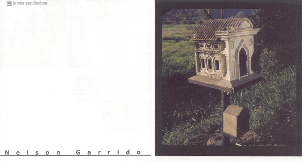 Las páginas centrales de Bisagra están dedicadas al más reciente trabajo del reconocido fotógrafo Nelson Garrido englobado bajo el título “La otra arquitectura”, una serie de imágenes que recogen pequeños objetos producto de la espontaneidad con que la gente intenta rememorar acontecimientos ligados a accidentes automovilísticos en los que está involucrada la muerte de algún familiar o amigo, generalmente ubicados al borde de las carreteras.