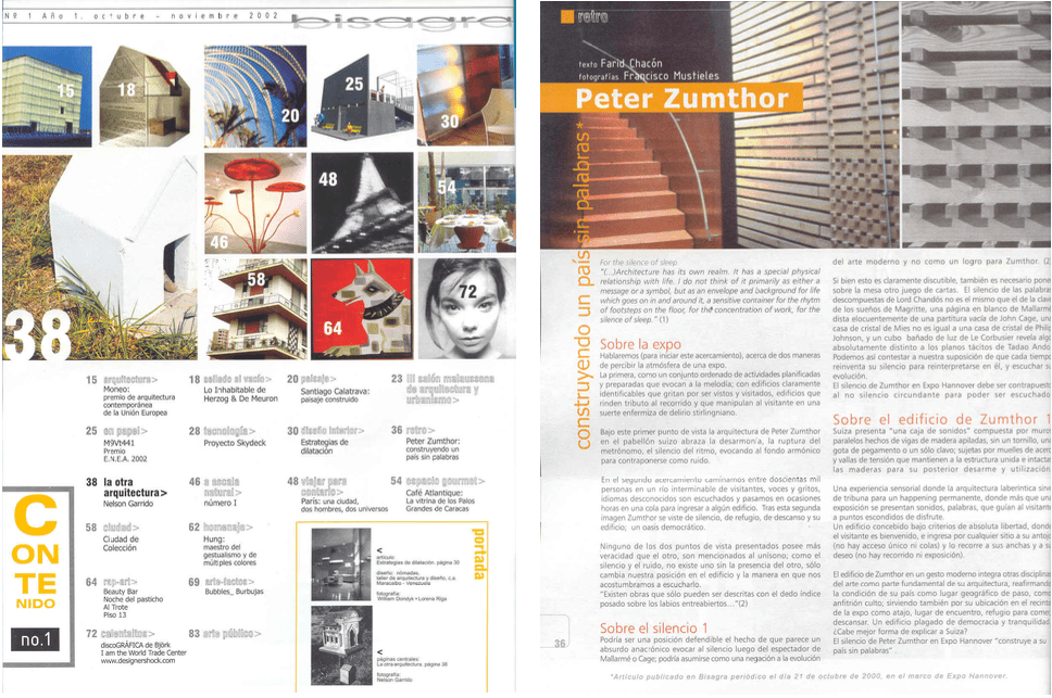 Fueron objeto de atención y reflexión para Bisagra la obra reciente de Herzog & De Meuron, Santiago Calatrava y, particularmente, de Peter Zumthor a quien se le dedicó un interesante artículo escrito por Farid Chacón con fotografías de Francisco Mustieles titulado “Peter Zumthor: construyendo un país sin palabras”, en el cual se lleva a cabo un análisis critico del pabellón presentado por Suiza en Expo Hannover 2000, un edificio que tenía unas medidas de 50 x 50 metros y una altura de 9 metros, y estaba hecho principalmente de madera. Llamada la “Caja de Sonido” o “Caja de esencias”, lo que hace honor a la visión que tiene Zumthor de la arquitectura como una experiencia completa que debe apreciarse con todos los sentidos, el pabellón es permeable y se puede acceder a él por cualquiera de sus lados, lo que hace que cada visitante tenga una percepción diferente en esta atmósfera cambiante. En el texto de Chacón se tocan temas como el ruido que toda Expo produce donde cada pabellón representativo intenta gritar por su cuenta, el particular sonido que dentro de tal alboroto produce la sosegada obra de Zumthor y el silencio casi místico que se percibe al penetrar en ella.