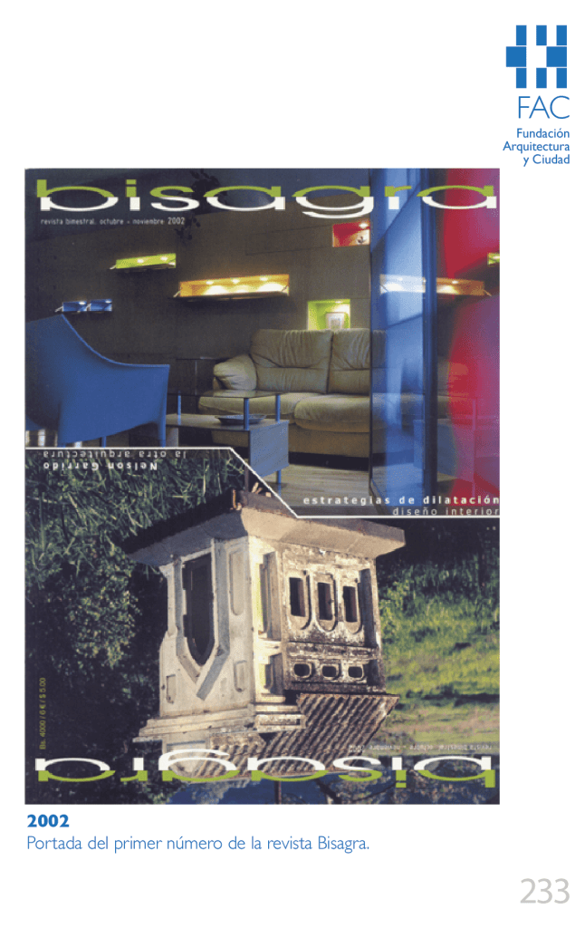 Concebida como una publicación de corte ligero dirigida a una amplia gama de lectores y con un diseño gráfico jovial, de la mano de Bisagra pudimos enterarnos de la obtención del Premio de Arquitectura Contemporánea (también conocido como el Premio Mies van der Rohe) que la Unión Europea le otorgó en 2001 a Rafael Moneo por el Palacio de Congresos y Auditorio Kursaal, complejo arquitectónico constituido de un gran auditorio, una gran sala de cámara, salas polivalentes y salas de exposiciones situado en San Sebastián (País Vasco), inaugurado en 1999.