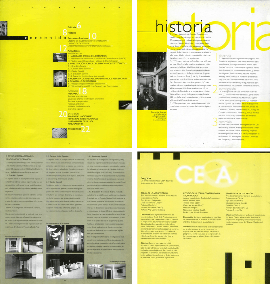 También se detallan las diversas asignaturas de pregrado dictadas por profesores adscritos al Centro: Teoría de la arquitectura -obligatoria- (Gabriel Rodríguez), Estudio de la forma construida en arquitectura -electiva- (Moisés Snitcovsky), Teoría de la proyectación -electiva- (Enrique Vila), Psicología ambiental -optativa- (Luis La Scalea), Habilidad de diseño espacial -optativa- (Lesmes Castañeda y Edwing Otero) y Gramática espacial -optativa- (Edwing Otero). Sobresale, en particular, la realización de hasta 13 publicaciones entre 1987 y 1997 por los miembros de su personal docente y de investigación.