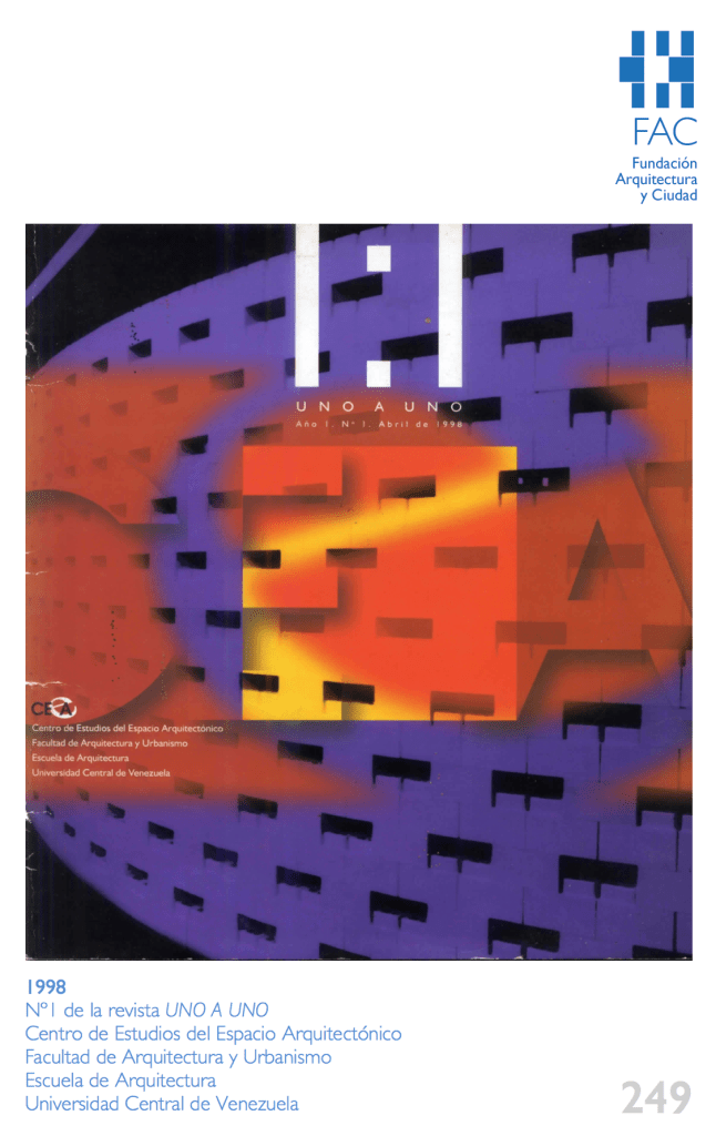 Aparece UNO A UNO por primera y única vez en abril de 1998 editada por el director del Centro de Estudios del Espacio Arquitectónico (CEEA) de la Escuela de Arquitectura de la FAU UCV, Isaac Abadí, su fundador y pilar fundamental. Incluye también la revista textos del propio Abadí, Humberto Cavallín, Luis La Scalea y Gabriel Rodríguez, integrantes del equipo del Centro en aquel momento. El diseño gráfico fue realizado por Álvaro Martín, la impresión por Italgráfica, tuvo un tiraje de 500 ejemplares y se ofrecía mediante una suscripción anual (sujeta a cambios) por un monto de 3.500 bolívares para Caracas, 4.000 para el interior del país y 10$ para el exterior más gastos de envío.
