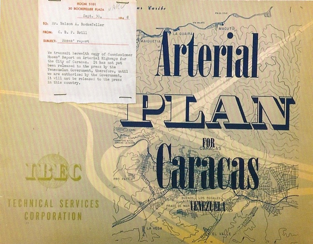 Más adelante, en 1948, Robert Moses, planificador estadounidense vinculado a Nelson Rockefeller, visita Caracas invitado por el gobierno de la ciudad, empeñado en ampliar las posibilidades de generar soluciones. Entre la aprobación en 1947 del Plan Nacional de Vialidad, enfocado a formular una red nacional de carreteras, puertos y aeropuertos, y lo que será en 1951 la salida del Plano Regulador y el Plan Municipal de Vialidad, Moses presentará el estudio de un “Plan Arterial para Caracas” en el que propone una gran red jerárquica de avenidas, ferrocarril y autopistas que mejorarían el tránsito y buscaba asegurar el desarrollo del área metropolitana. Hannia Gómez en Our Architects en Caracas. Arquitectura Norteamericana en Caracas. 1925-1975 (2017) se refiere al Plan Arterial, en el artículo dedicado a Moses, de la siguiente manera: «Tomando ideas del Plan Monumental de Caracas de Rotival de 1939, el Plan Arterial despliega un ramillete de tipologías viales, del parkway a la trinchera, de la autopista sobre camellón a la avenida flanqueada de palmeras…, de la vía expresa sobre el río sepultado a la carretera con peaje: el gran instrumento generador de recursos que tantos éxitos le había traído a Moses en Nueva York. Observando el Plan Arterial, nos queda claro que aunque Moses no llegara nunca a construirlo él mismo, Caracas sí lo hizo. Es parte de su paisaje urbano moderno. En su trama están casi todas las arterias del plan del 48: la Vía Expresa Caracas es la Avenida Sucre (1948), la Vía Expresa Capitolio es la Avenida Baralt (1961), la Vía Expresa río Guaire es la Autopista del Este (1953-54) y, sobre todo, la carretera con peaje Caracas-La Guaira es la autopista Caracas-La Guaira (1953), ‘puntualizada por altos viaductos’».