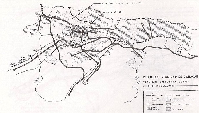 Cuando en junio de 1952 el Ministro de Obras Públicas, Gerardo Sansón, presentaba en público el Plano Regulador de Caracas elaborado en 1951, pone en evidencia cómo “además de los usos de la tierra propuestos y de las unidades vecinales que los encierran, la vialidad fue la estructuradora esencial… En primer lugar con el sistema de autopistas… Después con los alimentadores… Finalmente, con los seis sistemas internos del Plan Municipal de Vialidad, cuya sola enumeración permite, desde el presente de la capital, calibrar la magnitud del proyecto”, nos aclarará Martín Frechilla. El zoning se impone y el vehículo pasa a ser el protagonista de una ciudad que creció a la sombra de ambas concepciones importadas desde Norteamérica basadas en principios del funcionalismo urbano y la división en zonas homogéneas unidas por un conjunto de vías expresas. “Lo que sí es cierto es que el Plano Regulador de Caracas de 1951 mientras apuesta expresamente por los centros comerciales, el Plan Municipal de Vialidad remarca la linealidad comercial de las nuevas avenidas: Sucre, San Martín, Francisco de Miranda, Urdaneta, Victoria, Lincoln, …”, imponiéndose a la larga el criterio impulsado por el primero de la mano del aumento de la inseguridad, la crisis económica, el deterioro urbano y el incremento en el uso del vehículo, luego de un período de esplendor que acompañó al segundo.