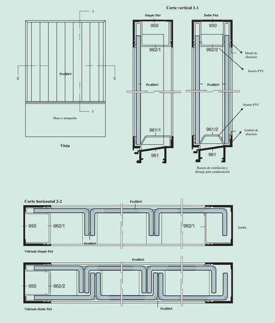 Su función es brindar apoyo al vidrio para evitar su contacto con el metal y su desplazamiento. Estos perfiles varían según la forma en que se va a instalar el sistema (en simple piel o en doble piel). Se utiliza sellador de silicona aplicado entre vidrios, entre aluminio y vidrio y entre las juntas de la perfilería de aluminio y la estructura resistente”.