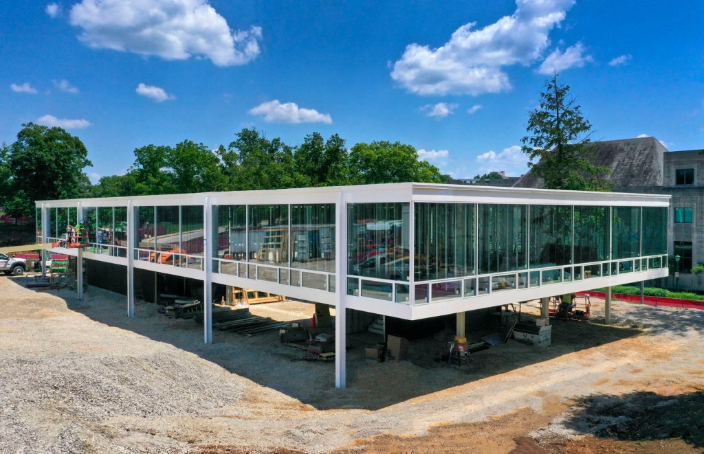 Un nuevo edificio para la Escuela Eskenazi de Arte, Arquitectura + Diseño de la Universidad de Indiana, materializa un diseño recientemente redescubierto de Mies van der Rohe. El proyecto de 1952 estaba destinado a una casa de fraternidad en el mismo campus de IU Bloomington donde se está construyendo actualmente, y el diseño incorporó el mismo marco de acero blanco y la misma estética de paneles de vidrio expansivos que la Casa Farnsworth, creada aproximadamente al mismo tiempo. Después de ser olvidado durante seis décadas, el diseño resurgió en 2013. La obra de dos pisos abrirá sus puertas este otoño.