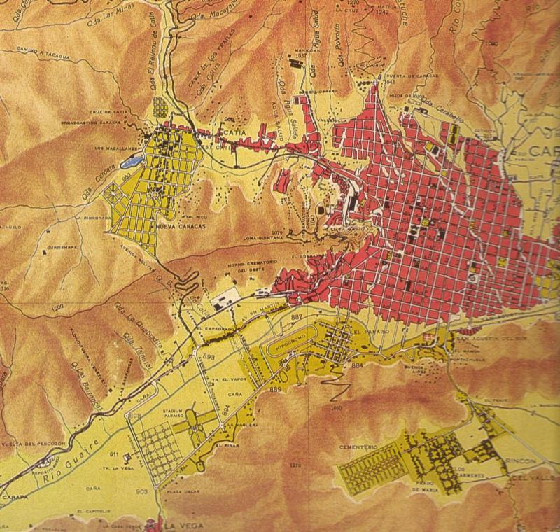 Es, sin embargo, el plano de 1929 de Razetti el que nos informa de dos situaciones interesantes. La primera es que ya aparece la conexión de la Avenida de La Vega con la Avenida San Martín (sector El Empedrado, Artigas) mediante la Avenida 19 de diciembre y en dicho encuentro, en el centro de la Avenida de La Vega, se visualiza la redoma donde inicialmente se había ubicado en 1911 y en solitario el “Monumento a Carabobo”. La segunda es que ya en 1929 la mencionada obra había sido trasladada (probablemente en 1921, año del centenario de la batalla, 111 del 19 de abril y 110 de la Firma del Acta de la Independencia) a un costado del Hipódromo sobre la Avenida Carabobo, presidiendo un espacio conformado por dos plazas gemelas “de equilibrada simetría, con elaborados jardines y caminerías sinuosas situadas a ambos lados del monumento, diseñadas por el ingeniero Ricardo Razetti y ubicadas transversalmente a la avenida…”, como nos indican María Isabel Peña y Gregory Vertullo en Caracas del valle al mar. Guía de arquitectura y paisaje (2015). Cabría añadir, por tanto, que el emplazamiento actual de La India, en la redoma situada al final de la Avenida Páez en el cruce con la O’Higgins (en las entradas de La Vega y Montalbán), obedeció a un segundo traslado del monumento realizado en 1966 en momentos en que se construyó el Distribuidor La Araña, hecho que afectó severamente el lugar donde se había emplazado por segunda vez en 1921.
