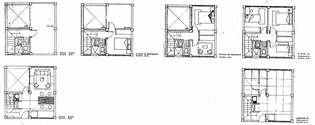 Así, ajustados a las bases del concurso que pedían “… ofrecer una solución para la creciente demanda de viviendas de muy bajo costo, que pudiera satisfacer las necesidades inmediatas de un núcleo familiar básico (pareja) y que pudiera crecer conforme dicho núcleo fuese creciendo y prosperando”, los ganadores diseñan “una vivienda o unidad básica que pudiera crecer hasta un máximo de 72 metros cuadrados de superficie útil y que, a efectos de reducir los costos por parte del comprador, contara inicialmente con un área mínima de 36 metros cuadrados y ofreciera claras posibilidades de crecimiento, a pesar de su ubicación en un desarrollo multifamiliar. (…) La unidad, al tener una forma geométrica pura, puede unirse con una o varias de diversas maneras, para producir agrupaciones multifamiliares, cuya forma dependerá del lugar donde se construya. Se pueden obtener edificaciones de casas alineadas, en bloques rectos o escalonadas que se adaptan a la topografía de manera semejante a las construcciones antiguas de nuestras ciudades, o unas sobre otras para formar edificios de apartamentos de hasta seis pisos. (…) La propuesta es un sistema de organización espacial que no depende de un sistema constructivo específico: puede construirse en concreto armado, acero o madera. También pueden ser utilizados otros materiales, dependiendo de la región y las características particulares de cada problema. (…) Su principal cualidad es su versatilidad para adaptarse a diversas condiciones ambientales, diversos grupos familiares y diversas formas de agrupación”.