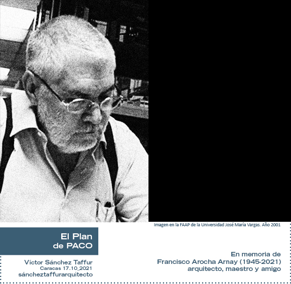 Al respecto, Sánchez Taffur en un sentido escrito realizado con motivo del fallecimiento de Francisco (Paco) Arocha el 2 de octubre de 2021 titulado “EL PLAN DE PACO. En memoria de Francisco Arocha Arnay (1945-2021), arquitecto, maestro y amigo”, publicado en su blog PROPUESTAS IN_CONSULTAS. Sobre arquitectura, docencia, y otros asuntos el 17 de octubre de 2021, señalará sobre el período que vivió como profesor y luego como director de escuela en la Vargas junto a Arocha: “Formamos un equipo exitoso y a mis 32 años obtuve un crecimiento personal significativo. Ganamos premios y reconocimientos internacionales, viajamos por más de ocho países en solo dos años, organizamos diferentes eventos, asistimos a congresos, propusimos espacios nuevos para la facultad, hicimos concursos y también exposiciones, fomentamos el intercambio con profesores de otras instituciones, trabajamos en publicaciones y quizá lo más importante: conformamos una excelente plantilla de docentes y una comunidad académica con mística y comprometida con aquel proyecto, que en el fondo era el de Paco, él era su guía silente desde hacía varios años y el cerebro detrás de bastidores”.
