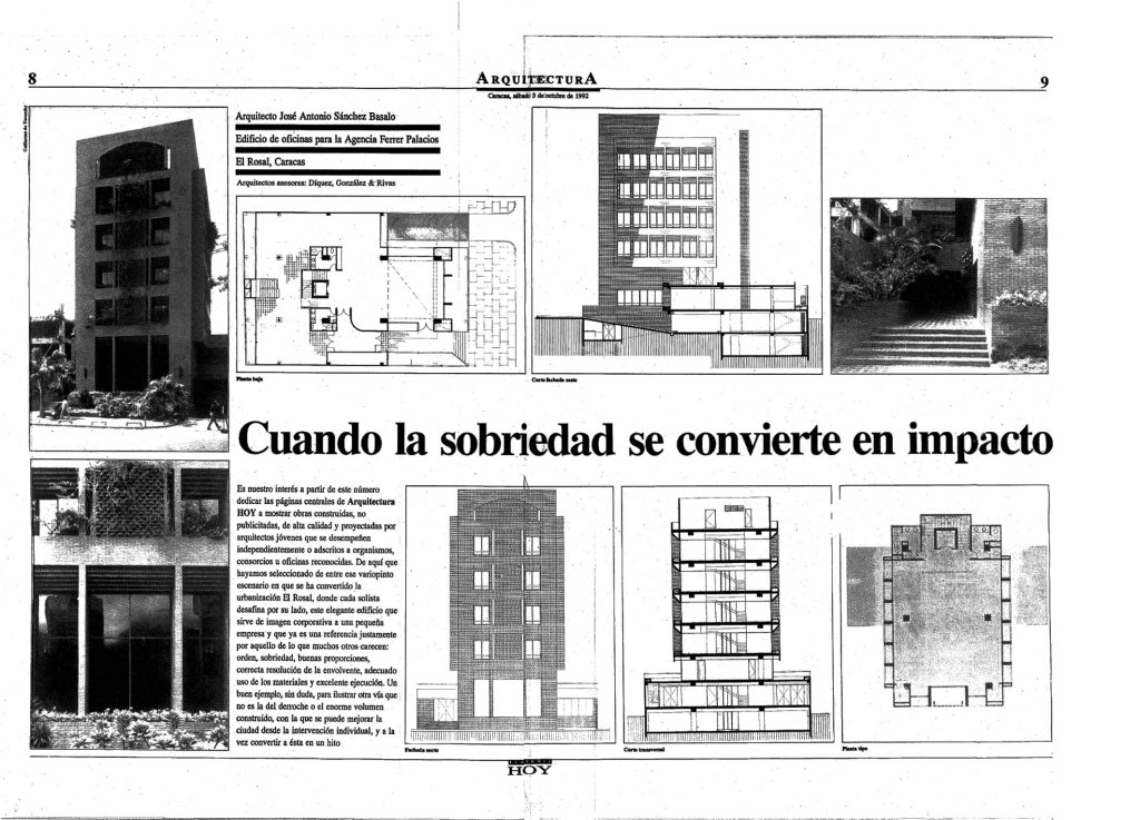 No está de más destacar que cuando en 1992 apareció el encartado Arquitectura HOY en la edición sabatina del diario Economía HOY y a partir del número 3 del 3 de octubre, sus editores deciden “dedicar las páginas centrales … a mostrar obras construidas, no publicitadas, de alta calidad y proyectadas por arquitectos jóvenes que se desempeñen independientemente o adscritos a organismos, consorcios u oficinas reconocidas”, se seleccionó, no por casualidad, el edificio sede de la Agencia Ferrer Palacios para dar inicio a esa manera de mostrar buena arquitectura. “Un buen ejemplo, sin duda, para ilustrar otra vía que no es la del derroche o el enorme volumen construido, con la que se puede mejorar la ciudad desde la intervención individual, y la vez convertir a ésta en un hito”.