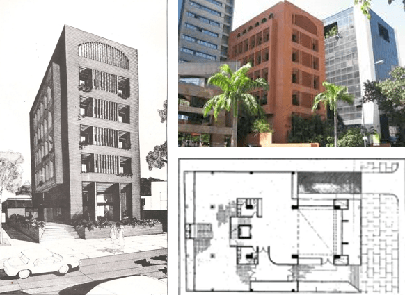 De la nota que acompaña su publicación dentro del catálogo de la VIII Bienal Nacional de Arquitectura (1987) cuando optó por el Premio Metropolitano (jurisdicciones del Distrito Federal y Distrito Sucre), tomamos lo siguiente: “El edificio en sí, es muy sencillo en cuanto a distribución; cuenta con un solo núcleo de circulación que relaciona a todas las plantas… Está conformado por una planta Sótano II, destinada a archivos muertos; una planta Sótano I destinada a estacionamiento; una Planta Baja de acceso a la torre y a las dependencias públicas que se encuentran en este nivel; una Mezzanina que está relacionada directamente con la planta baja y cuatro plantas tipo, de concepto “Espacio Abierto” para la utilización de la parte administrativa de la agencia; (y) una última planta sin techo que sirva como desahogo a la edificación, en este caso se planteó una cancha de paletas por sugerencia del propietario”.