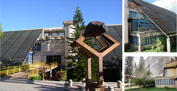En cuanto al edificio en sí lo primero que cabe señalar es que su implantación obedece a una dirección distinta al resto de los integrantes del campus, adaptándose más bien a las directrices del espacio urbano del Paseo Los Ilustres. En la ficha elaborada por Sebastián Monteagudo para Caracas del valle al mar. Guía de arquitectura y paisaje (2015) encontramos que la Escuela fue construida “salvando el desnivel en el borde sur de los terrenos de la universidad; la planta de acceso se genera un nivel por encima del suelo y el ingreso se resuelve a través de un puente. En su composición hay elementos que la distinguen pero guardan relación con la Ciudad Universitaria. La estructura, de concreto, se expresa en la potente fachada hacia el paseo Los Ilustres, que revela (su) vigoroso esqueleto estructural… Esta cara contundente se orienta a la ciudad, y contrasta con la frágil persiana metálica que se muestra hacia el campus, que cubre la altura del volumen. Este dispositivo de control climático genera sombras entre las aulas, que se abren a terrazas, el jardín de palmas y el juego de luces que se filtra a través del cedazo que lo cubre. Las plantas, organizadas a partir de un corredor central, rematan en escaleras exteriores. Al centro, se ubica la torre de circulación vertical, coronada por una ligera pérgola metálica que protege el corredor hacia la biblioteca y el cafetín. Completa la pieza un enorme cilindro a doble altura, que alberga los laboratorios de ensayo, y actúa como marca de uno de los accesos al campus”.