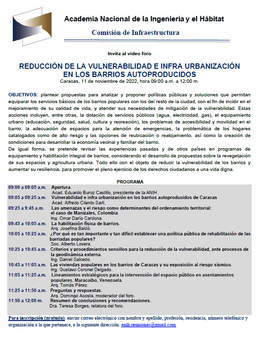 La Comisión de Infraestructura de la Academia Nacional de la Ingeniería y el Hábitat invita al video foro