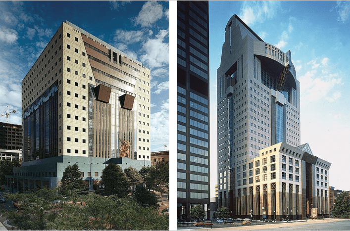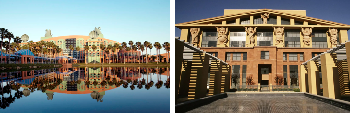 De Wikipedia rescatamos que “Graves y su firma también diseñaron varios edificios para Walt Disney Company en estilo posmoderno. Estos incluyen la sede de Team Disney en Burbank, California; los resorts Dolphin (1987) y Swan (1988) en Walt Disney World en Florida; y Disney’s Hotel New York (1989) en Disneyland París. Patrick Burke, el arquitecto del proyecto de los dos hoteles turísticos en Florida, comentó que Walt Disney Company describió los diseños de Graves como ‘arquitectura de entretenimiento’. Además de los edificios del hotel Swan y Dolphin, la firma de Graves diseñó sus interiores originales, muebles, señalización y obras de arte. Otros encargos notables de Graves para edificios que se completaron en la década de 1990 incluyen una expansión de la Biblioteca Pública de Denver (1990) y la renovación del Instituto de Artes de Detroit (1990)”.
