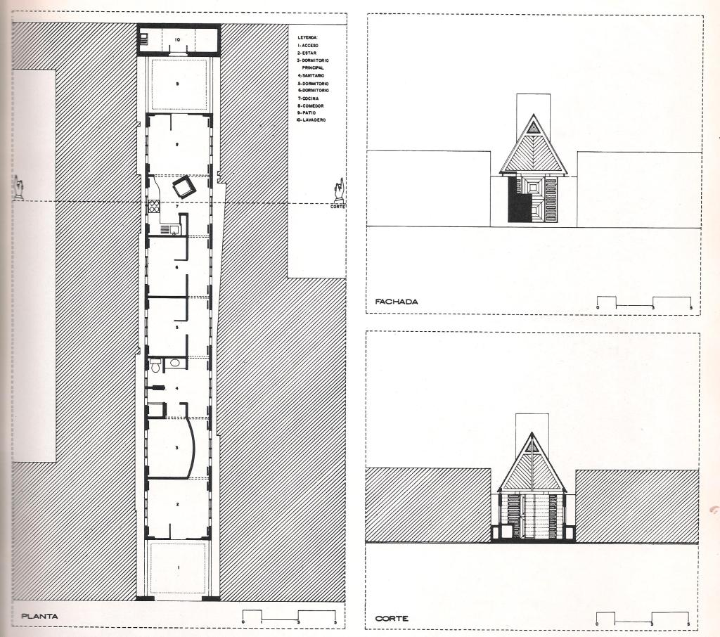 Pensada para resolver las restringidas condiciones que imponía una parcela de 4,50 metros de ancho por 31 metros de largo dentro de un tejido urbano de viviendas adosadas de características similares, urbanizado por el Concejo Municipal de Higuerote en los años ’50, Sanz opta por convertir, como normalmente lo hacía, su aproximación al problema como oportunidad para explorar un esquema alejado de lo que podía ser una respuesta convencional.
