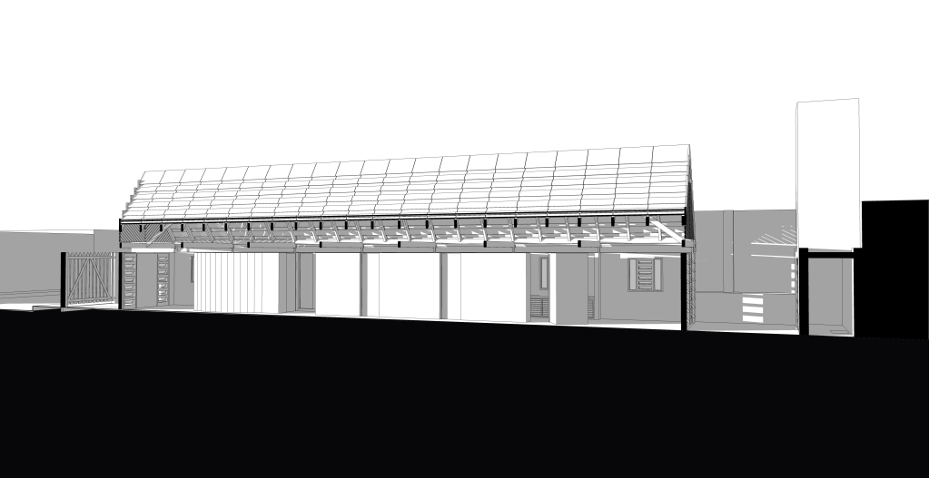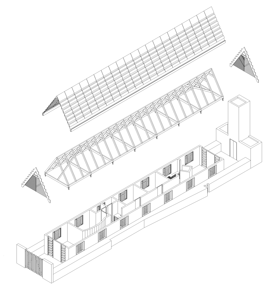 El sistema constructivo, sencillo y elemental, a base de paredes de carga hechas con bloques de concreto en obra limpia, machones y vigas de corona, aunque le sirve de soporte, es prácticamente independiente del utilizado para el techo a dos aguas y alta cumbrera, resuelto con una estructura de madera cubierta de láminas metálicas galvanizadas, diseñado para mitigar las inclemencias del clima. En otras palabras, y reforzando la originalidad planteada con relación a la solución para la iluminación y ventilación, “se optó por utilizar el mismo esquema de ubicación de ambientes, pero eliminando el patio interno, por dificultades dimensionales y porque, además, este esquema obliga a mantener las habitaciones adosadas a uno de los linderos laterales”, señalará Sanz en la memoria ya citada.