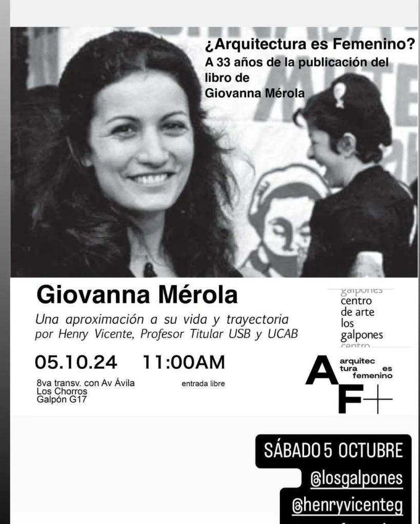 ¿Arquitectura es femenino? A 33 años de la publicación del libro de Giovanna Mérola se llevará a cabo el sábado 5 de octubre 2024 a las 11:00 am en Los Galpones de Los Chorros. Con este evento se abre un espacio de acercamiento a la obra de Mérola, tomando como punto de partida el hito que supuso la aparición hace más de tres décadas de Arquitectura es Femenino, libro que sirve de motivación y que da nombre a nuestro grupo de arquitectas. En este sentido, los invitamos a una charla con Henry Vicente, titulada: Giovanna Mérola. Una aproximación a su vida y trayectoria, primera de dos sesiones, contando la segunda con la participación de tres arquitectas entrevistadas por Mérola en su libro: Hélène de Garay, Marilén Hobaica y Maricarmen Sánchez.