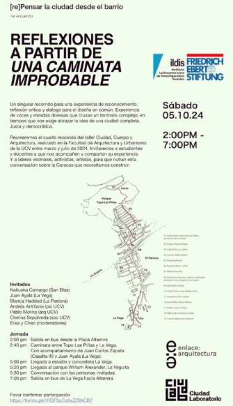 El sábado 5 de octubre a partir de las 2:00 pm, recrearemos el cuarto recorrido del taller Ciudad, Cuerpo y Arquitectura, realizado en la Facultad de Arquitectura y Urbanismo de la UCV entre marzo y julio de 2024. Invitaremos a estudiantes y docentes a que nos acompañen y compartan su experiencia. Y a líderes vecinales, activistas, artistas, para que nutran esta conversación sobre la Caracas que necesitamos construir.