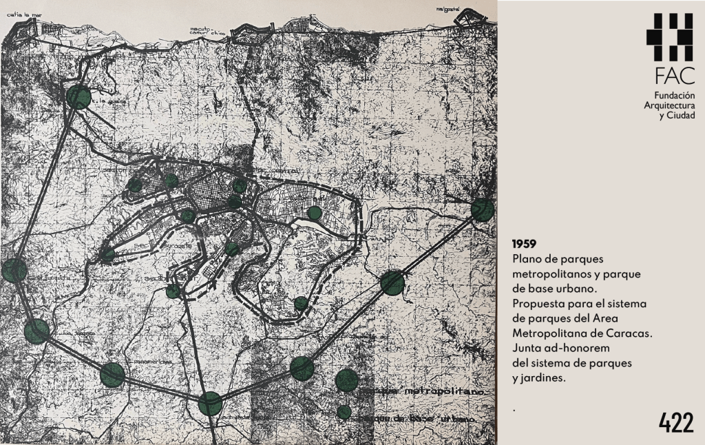 La imagen que acompaña nuestra postal de hoy hace referencia al “Proyecto del sistema de parques y jardines” para Caracas desarrollado por la Junta Ejecutiva “ad honorem” creada el 30 de marzo de 1959, a solo dos meses del inicio del gobierno de Rómulo Betancourt. El plan elaborado para la Gobernación del Distrito Federal bajo la gestión de Francisco Carrillo Batalla, intentó darle un impulso al desarrollo de la ciudad, entendiendo los problemas de áreas verdes y los espacios públicos como un gran proyecto capitalino, destinado a mejorar la calidad de vida de los ciudadanos.