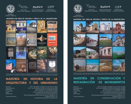 A partir de mañana 11 de noviembre y hasta el 22 de enero de 2025 estará abierto el proceso de preinscripción de las Maestrías en Historia de la Arquitectura y del Urbanismo y en Conservación y Restauración de Monumentos, que la Escuela de Arquitectura Carlos Raúl Villanueva ofrece a través de la Coordinación de Estudios de Postgrado de la Facultad de Arquitectura y Urbanismo de la Universidad Central de Venezuela.
