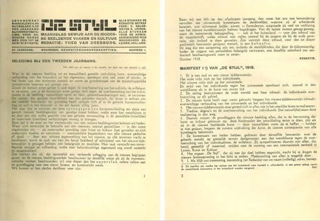 Es así como tras la estela de Van Doesburg y Mondrian y habiendo éste último aclarado que con el término “stijl” los artistas “no se referían un conjunto de características formales, sino a una voluntad de forma que iba más allá del arte mismo” y que “la lucha de estilo que propugnaban no buscaba imponer unas determinadas formas, teniendo como objetivo el lograr expresar lo intemporal (universal), lo eterno y aquello que convierte a cada estilo en estilo”, transcurrirá un poco más de un año y habrán aparecido 12 números de la revista hasta que se publica el ya citado Manifiesto I.